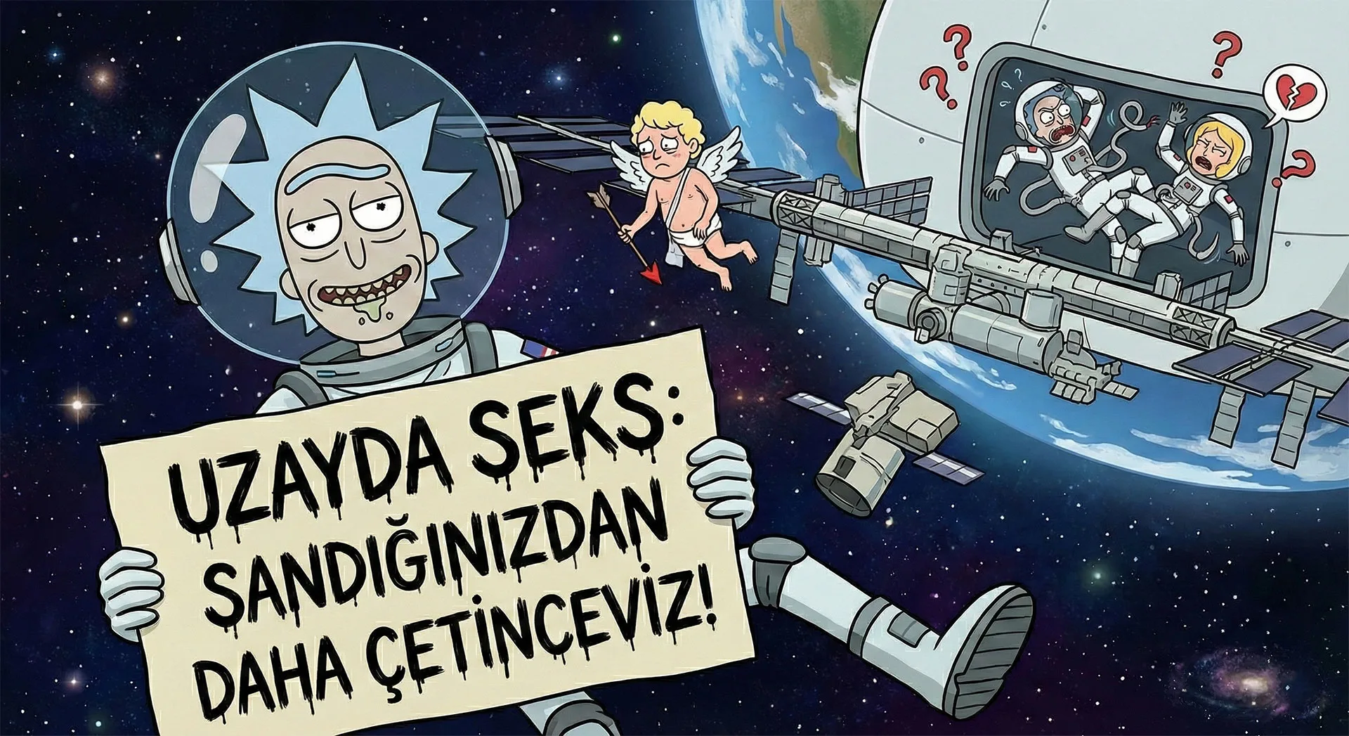 NASA ısrarla, “Hayır Rick, Uluslararası Uzay İstasyonu’nda (ISS) kimse kimseyle yatmadı, biz çok profesyoneliz” diyor. Hadi oradan! Uzay çağının başından beri 700’e yakın insan atmosferin dışına çıktı. O daracık kapsüllerde, dünyanın manzarasına bakarken kimsenin aklından “acaba?” sorusunun geçmediğine inanmamı mı bekliyorsunuz? Siz Jerry misiniz?